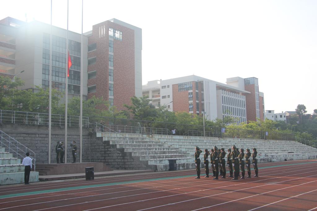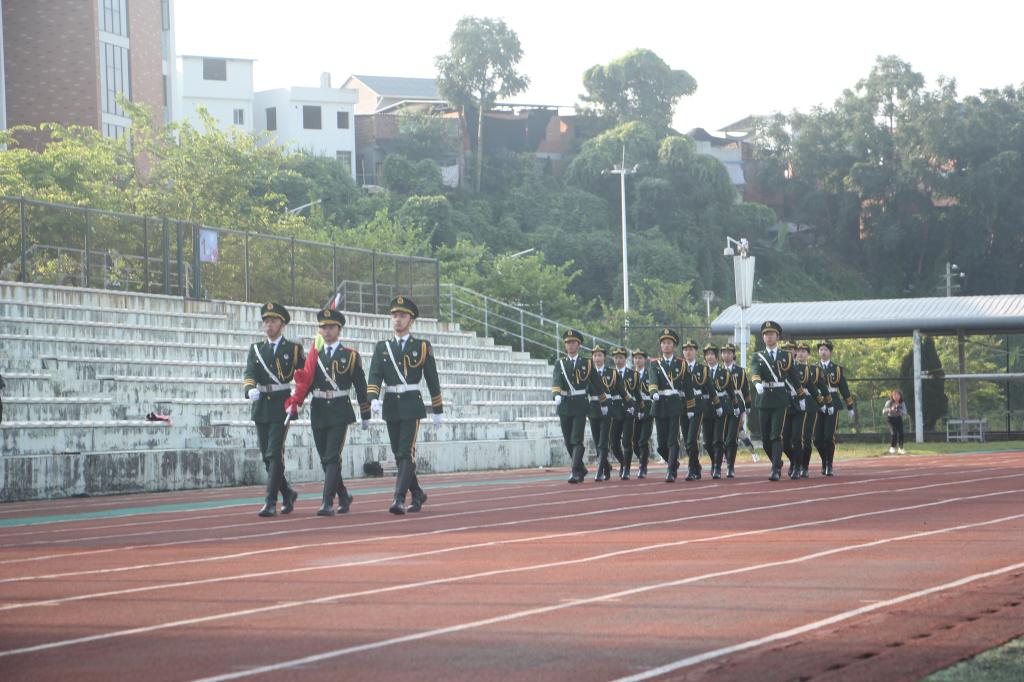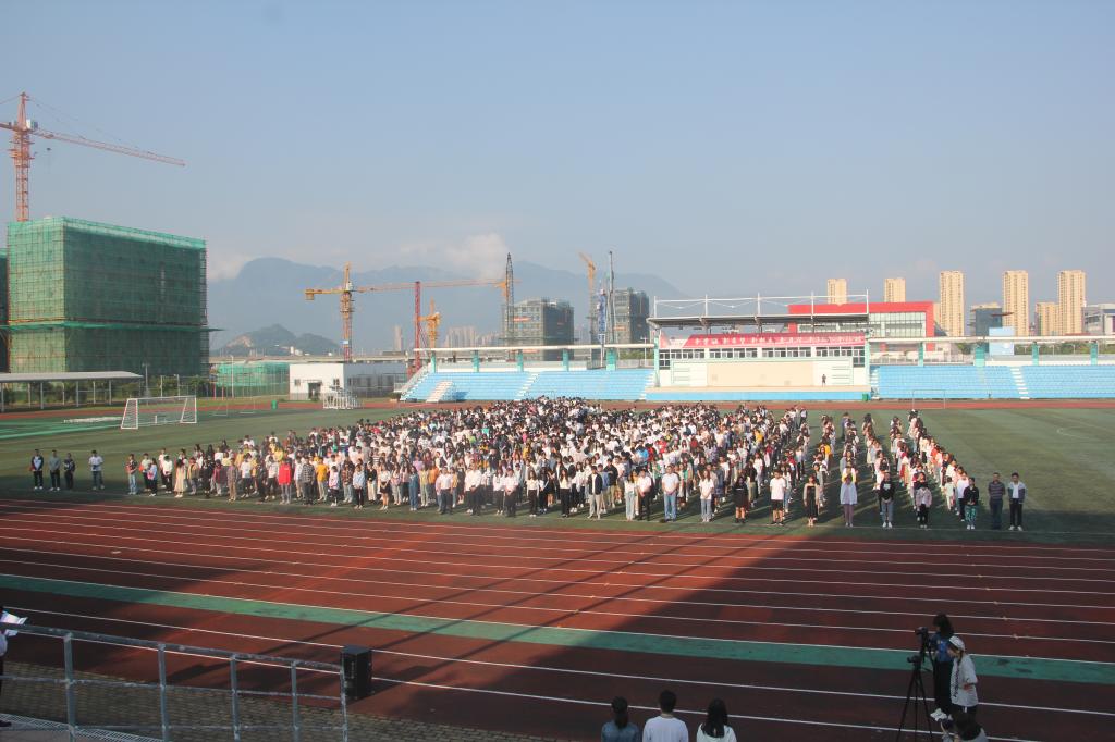 为共同庆祝中华人民共和国成立71周年,进一步深入开展爱国主义教育,激发广大师生的爱国热情,10月1日上午,我校在东侨校区田径场举行“爱国情·强国志”升国旗仪式。校党委书记夏良玉、校长魏远竹,以及假期留校的1100多名师生代表齐聚田径场,共同参加升旗仪式。在铿锵有力的步伐和整齐嘹亮的口号声中,国旗护卫队护送五星红旗,缓步走向升旗台。伴随着雄壮的《义勇军进行曲》,鲜艳的五星红旗冉冉升起,迎风飘扬。