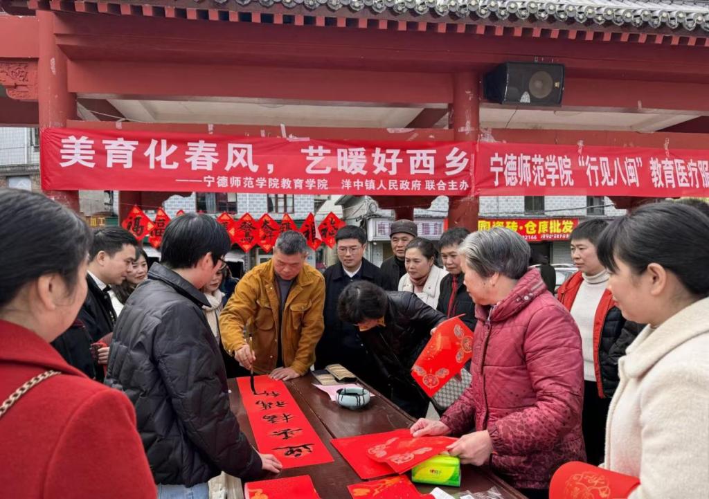 1月26日,教育学院艺术教育系师生赴宁德市蕉城区洋中镇东山村开展了春风化雨·美育浸润行活动。活动由艺术教育系系主任阮蕾晔老师、公共美育科研主任王红伟老师带队,师生代表共同参与。在洋中镇好西乡广场,师生现场挥毫泼墨,书写春联与“福”字,完成一幅幅寓意吉祥的作品,并开展简易剪纸互动教学,手把手指导村民体验传统艺术。现场还收集群众对文化活动的意见建议,为后续精准化、常态化开展美育服务提供参考。在东山村半...