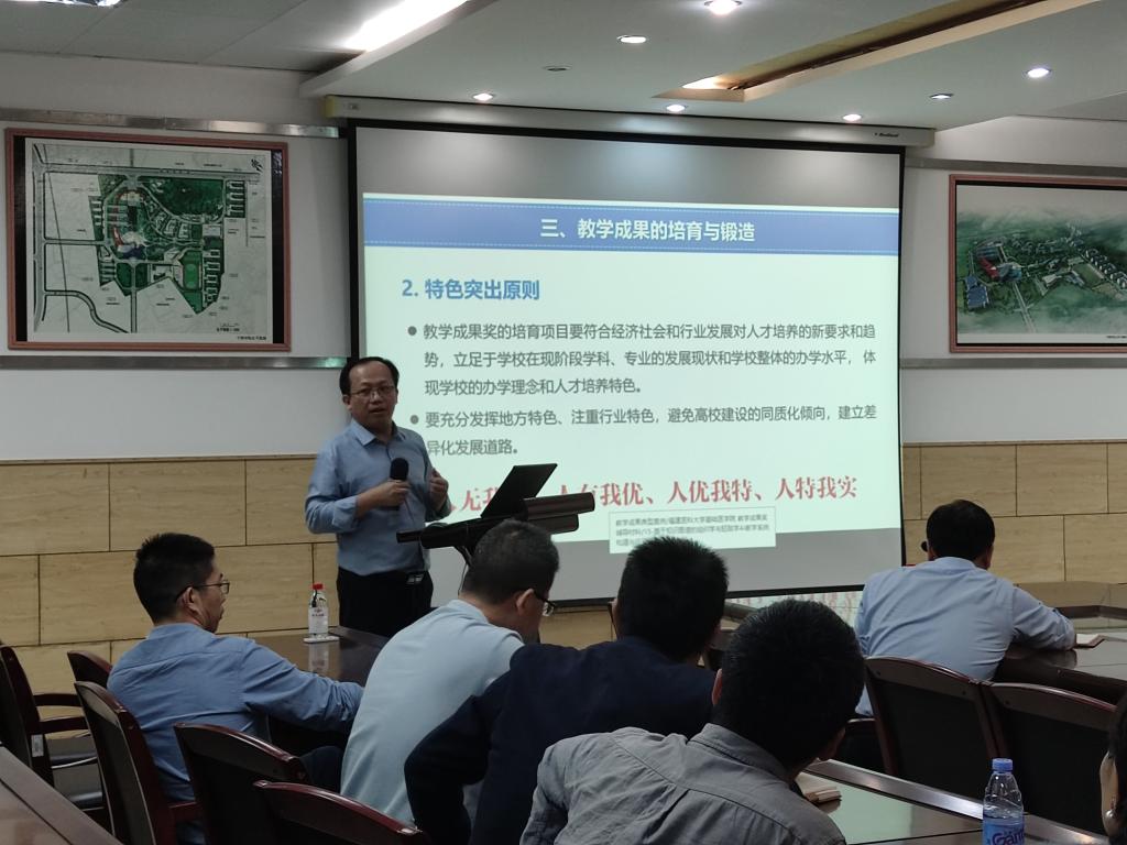 10月31日下午,福州大学张友坤副处长应邀到我校作《精准培育 深度凝练  高效申报——新时代高等教育教学成果奖高质量产出实战攻略》专题讲座,讲座由教务处处长应少明主持,各二级学院院领导、教学成果奖项目负责人或团队成员、专任教师代表参加了本次讲座。