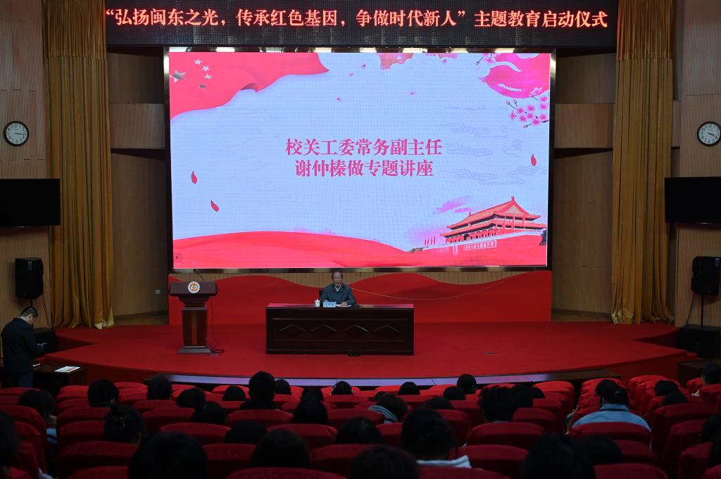 11月20日下午,我校关心下一代工作委员会(简称“校关工委”)在图书馆报告厅举行2025年“弘扬闽东之光,传承红色基因,争做时代新人”主题教育活动的启动仪式。校党委副书记、校关工委主任江潮炳出席仪式并讲话。校关工委常务副主任谢仲榛、各二级学院关工委主任、校关工委成员以及2025新生代表350余人参加了活动。