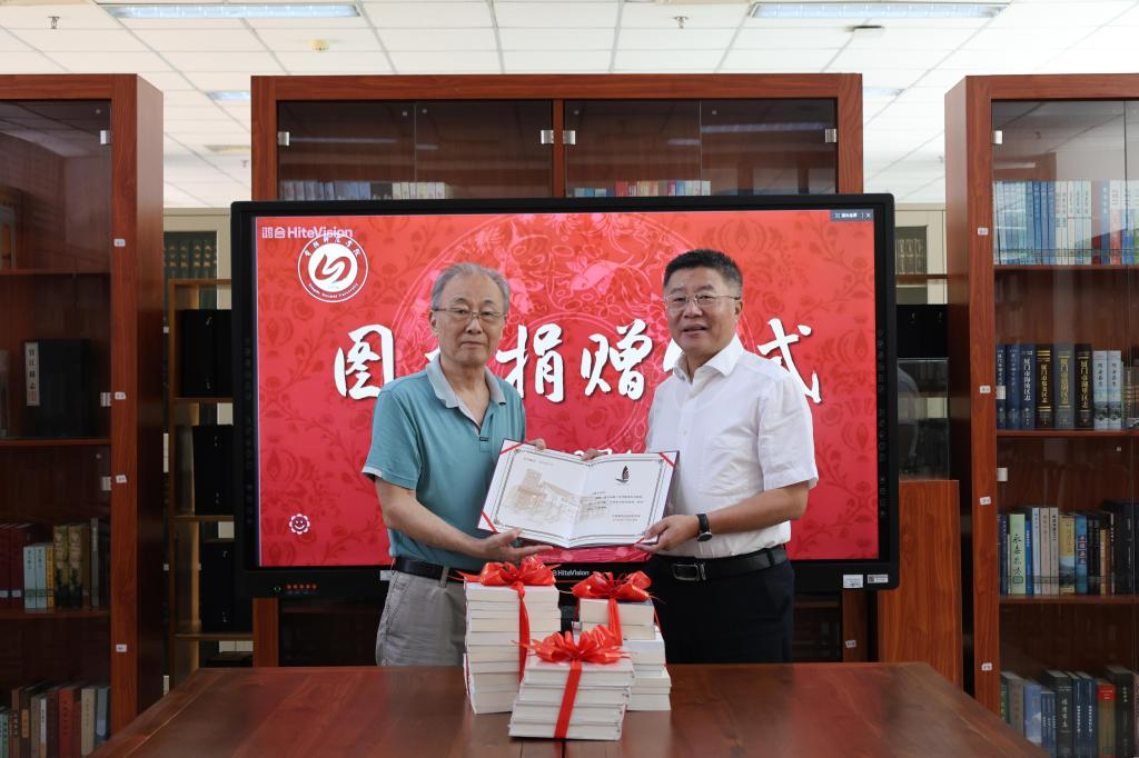 王豫生向我校图书馆捐赠了个人著作《愚生论教》及系列教育丛书。他充分肯定了学校近年来的发展建设成效,结合数十年教育实践经验,分享了优化办学特色、丰富办学内涵、培养高素质应用型人才的看法和感想。