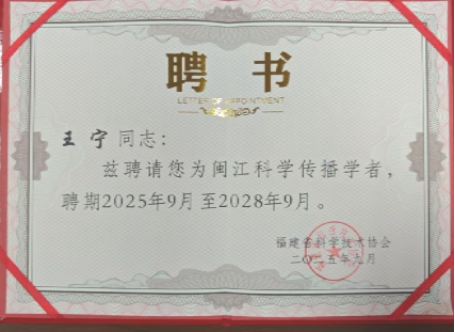 据悉,闽江科学传播学者,是福建省科学技术协会设立的一个荣誉称号,旨在组织广大科技工作者参与科学传播,大力弘扬科学精神和科学家精神,提高科普公共服务能力,提升我省公民科学素质。经过单位推荐、资格审核、专家评选、社会公示等程序,全省共有55位专家入选第八批闽江科学传播学者。