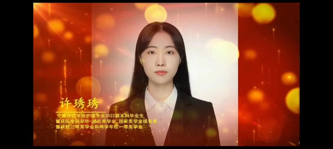 许琇琇在校期间认真学习专业知识,努力规范自身护理操作技术,曾获得“校优秀学生一等奖学金”、“国家奖学金提名奖”、“省运会优秀志愿者”、“医学院菲华-鸿志奖学金”、“宁德市直机关优秀共青团员”、“校三好学生”等荣誉。许琇琇说:“明确学习目标,能够事半功倍。我们所学的每一个知识点,未来都有可能在临床上遇到,而不只是应付考试。我将始终坚守南丁格尔誓言,不断努力,奋发向上,努力传递爱和正能量,做一位有温度的白衣天使。”