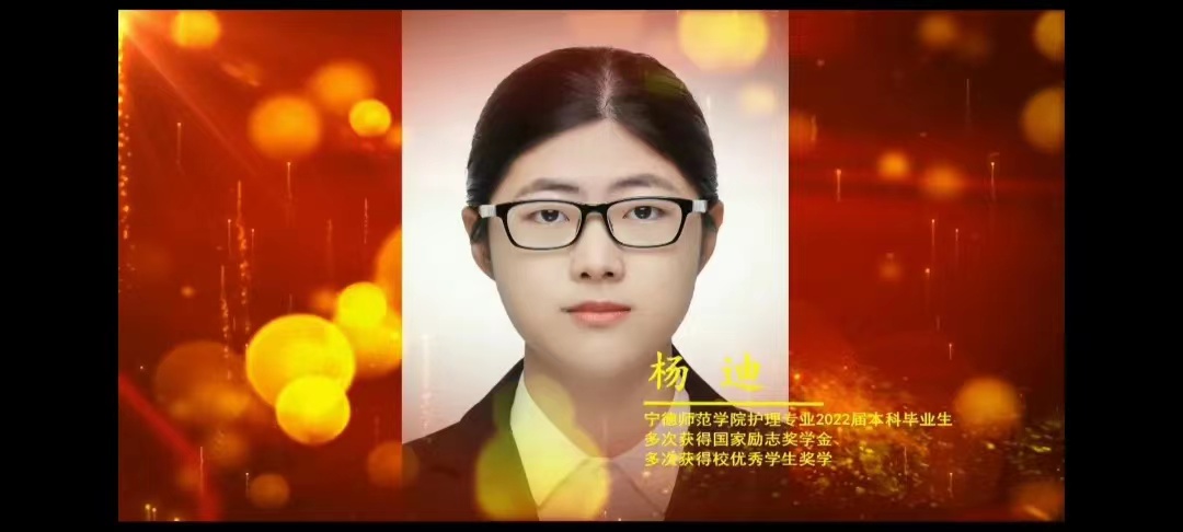 杨迪是一位品学兼优的学生,多次获得“校优秀学生一等奖学金”、“国家励志奖学金”、“校三好学生”、“志愿服务标兵”等荣誉。课余时间,积极参加志愿活动,发挥自身专业优势,热心奉献社会,志愿服务他人。杨迪说:“我相信学习是会使人踏实的,因为这能让你有勇气,有底气面对一切困难。那些所有不起波澜的日复一日,终会因为某一天的厚积薄发让人看到坚持的意义。学习护理带给我深深的责任感和使命感,因为只有拥有渊博的学问和熟练的技能,才能在面对神圣生命的时候自信从容。”