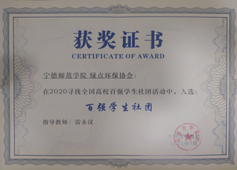 宁德师范学院绿点环保协会入选全国高校“百强学生社团”荣誉证书