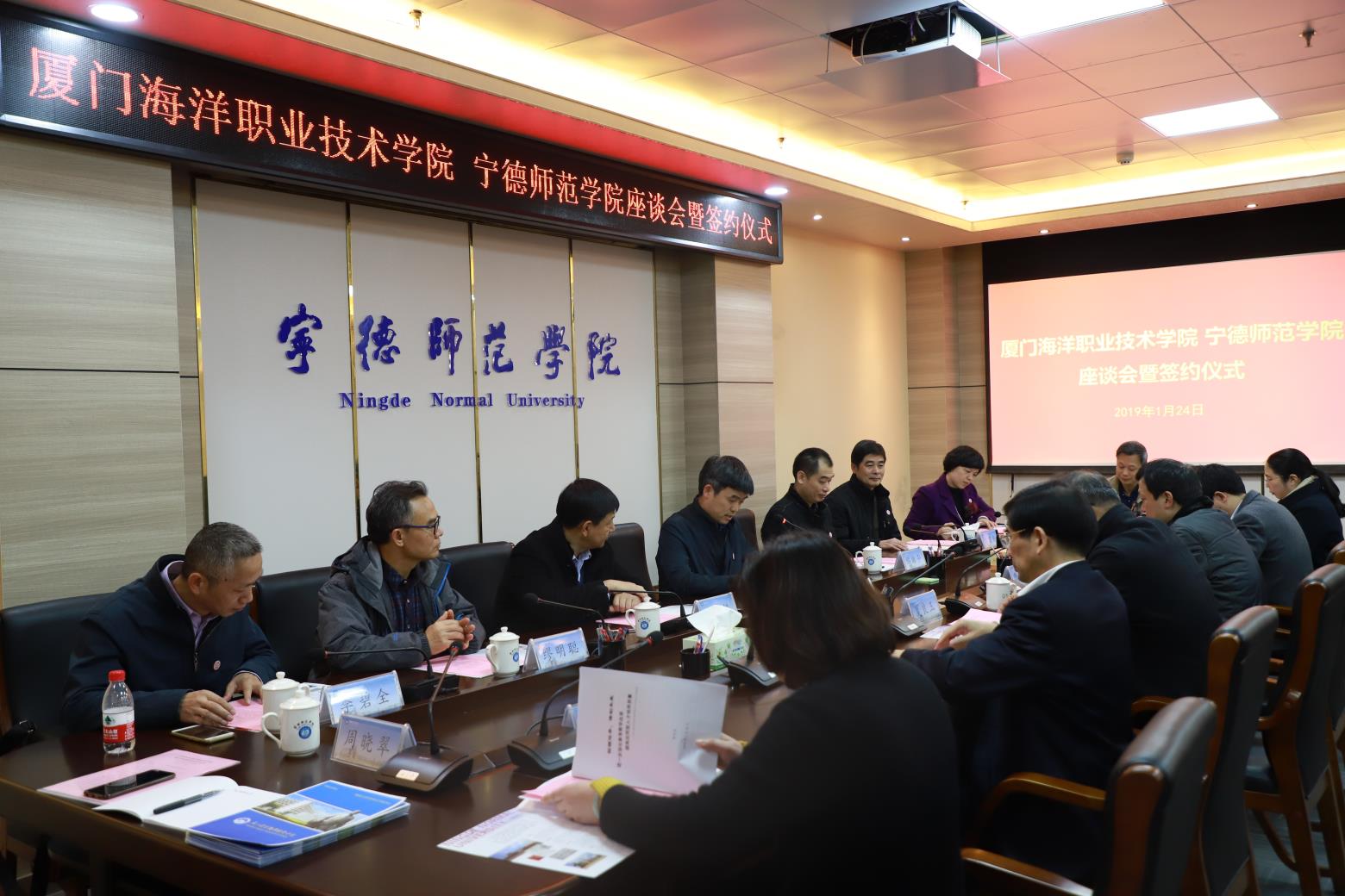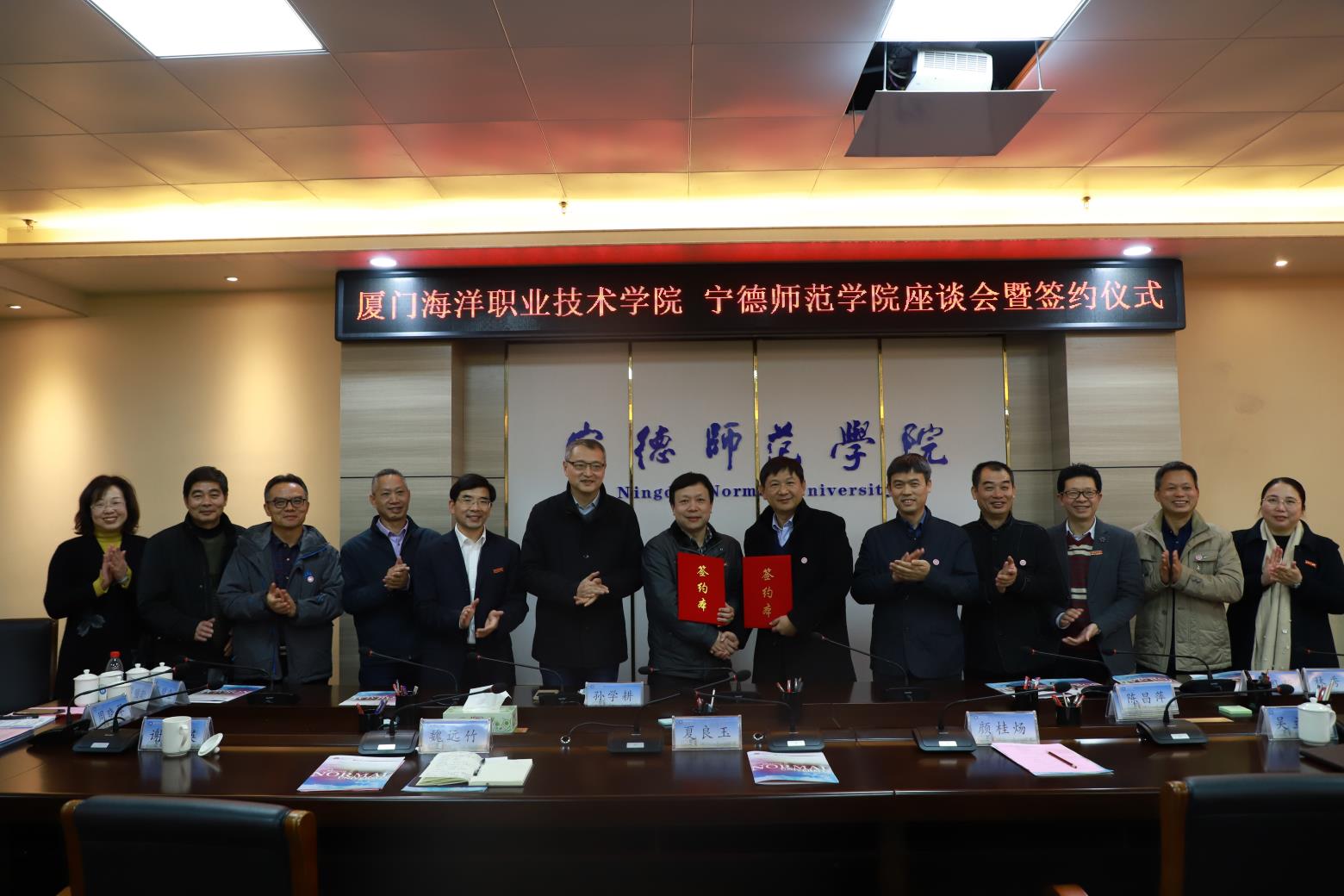 1月24日,厦门海洋职业技术学院院长陈昌萍一行9人来我校考察交流并签署战略合作框架协议。校党委书记夏良玉、校长魏远竹出席座谈会,副校长颜桂炀代表学校与厦门海洋职业技术学院签订合作框架协议。我校人事处、发展规划处、教务处、科研处等部门负责人,以及生命科学学院教师代表参加座谈会。