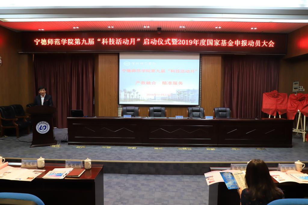 2018年11月27日下午,我校隆重召开宁德师范学院第九届“科技活动月”启动仪式。本届科技活动月的主题是:产教融合、精准服务。宁德市部分市直单位的领导,部分县市和基层乡镇的负责人和企业界朋友,校领导魏远竹、徐晓丹、颜桂炀、陈旺玉,以及我校的师生代表共计140余人参会,校长魏远竹致开幕辞,副校长颜桂炀主持启动仪式。