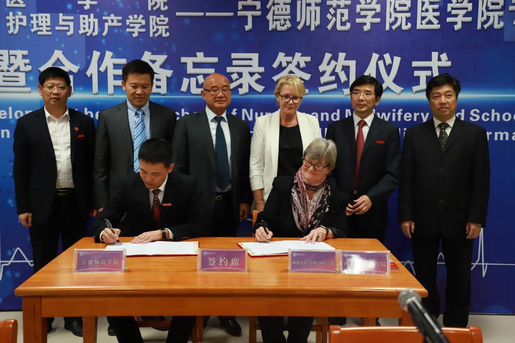 11月17日下午,我校医学院与澳大利亚西悉尼大学医学院、护理与助产学院专业建设研讨会暨合作备忘录签约仪式在东侨校区图书馆一层阅览室举行。校长魏远竹、副校长谢向东、陈旺玉,宁德市外侨办主任林岩峰,宁德市卫计委主任李惠长,澳大利亚西悉尼大学医学院院长安妮玛丽·亨内斯教授、护理与助产学院院长黛博拉·海切尔教授、心胸外科博士林文灯,福建省人民医院原院长孙朗清,以及医学院有关领导教师,宁德市各医院领导、业务科室负责人等50多人参加研讨会。陈旺玉主持会议。