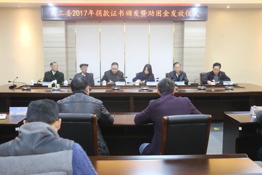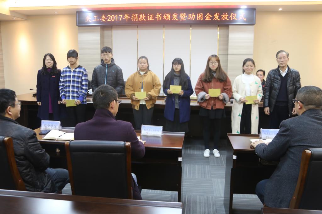 12月27日下午,校关工委在东侨校区行政楼二层会议室举行2017年捐款证书颁发暨助困金发放仪式。校党委副书记、校关工委主任徐晓丹出席并讲话,校党委宣传部长赵公弼,校关工委常务副主任谢仲榛,校关工委副主任林德强,五老报告团成员吴春,各二级学院领导、团委书记,以及29名受助学生参加了活动。发放仪式由校关工委秘书长张秋良主持。
