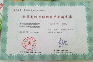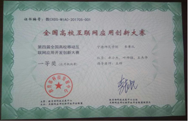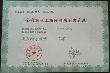 2017年12月1日至3日第四届全国高校移动互联网应用开发创新大赛全国总决赛在中国地质大学(武汉)举行。经过激烈角逐,我校信息与机电工程学院王辉老师指导的团队(队员卓小杰、王杰华、叶师强)荣获挑战赛一等奖(全国共有8支队获此殊荣),杨烈君老师指导的团队(队员江进宝、王富城、林鸿鹏)荣获挑战赛二等奖。王辉老师荣获优秀指导教师奖。