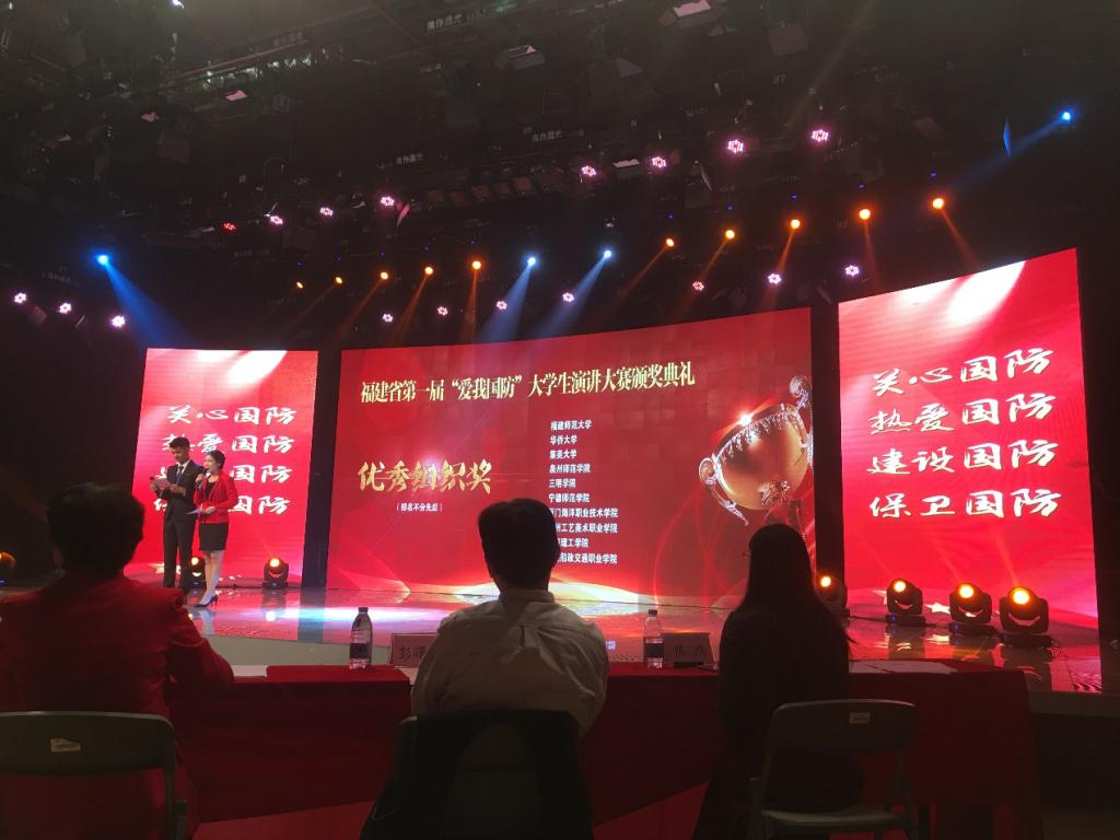 2017年10月30日,“爱我国防”福建省大学生主题演讲比赛在福建师范大学现代技术中心举行。来自全省各高校的300多名选手报名参赛,历经网络选拔,专家评审,共有18组选手突出重围,成功站到省赛舞台之上。其中,我校信息与机电工程学院2016级电子信息工程班荣怡飞,语言与文化学院文化创意与新媒体2班宋子菁同学顺利跻身决赛行列。