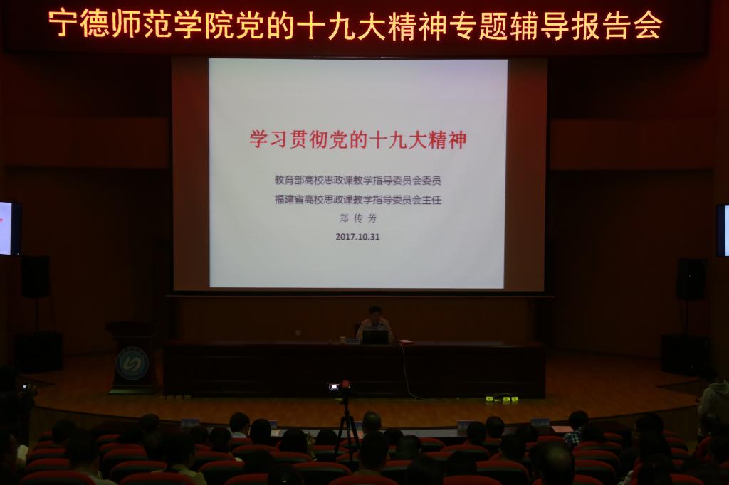 10月31日下午,我校邀请中央马克思主义理论研究和建设工程首席专家、博士生导师郑传芳教授作党的十九大精神专题辅导报告会。郑传芳教授同时也是我校特聘教授,是我校习近平新时代中国特色社会主义思想研究中心顾问。校党委书记夏良玉、校长魏远竹、副校长谢向东、副校长杨峰、副校长颜桂炀,科级以上干部、全体党员教职工、马克思主义学院全体教师、青马班学员,思政专业全体在校生共460多人听取了报告。魏远竹主持报告会。