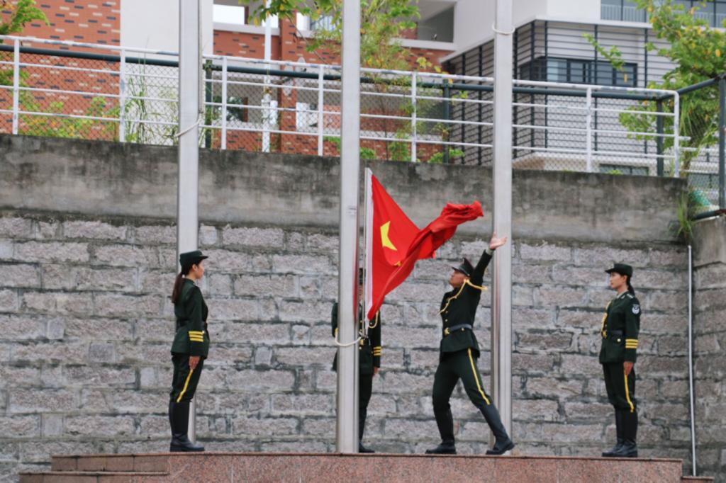 8点30分,在朝阳的映照下,国旗护卫队迈着铿锵有力的步伐来到了国旗台下,全场庄严肃穆,在激昂的国歌声中,升旗手振臂一挥,五星红旗冉冉升起。