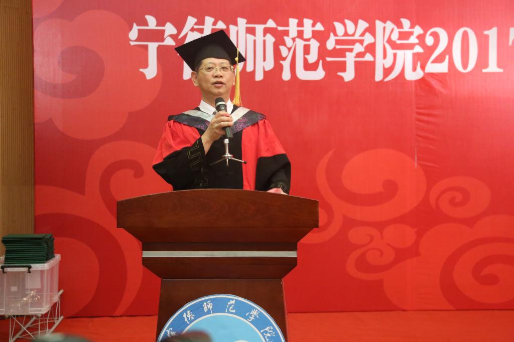 谢向东宣读了我校学位评定委员会关于授予2017届汉语言文学、英语、数学与应用数学、化学、生物科学、生物技术、电气工程及其自动化、机械设计制造及其自动化、应用化学、食品科学与工程、计算机科学与技术、思想政治教育、市场营销、酒店管理、体育教育、小学教育、音乐学等17个本科专业1229位毕业生文学、理学、工学、法学、管理学、教育学或艺术学学士学位的决定。