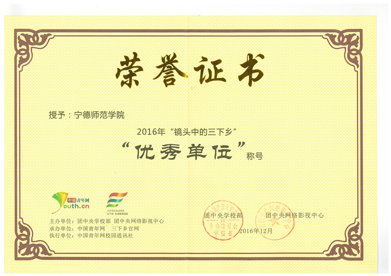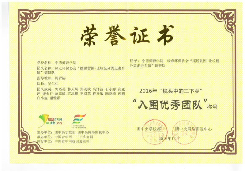 近日,由团中央学校部、团中央网络影视中心共同组织开展的2016年“镜头中的三下乡”总结表彰会在对外经济贸易大学举办。经风采展示、网络投票、评审打分等环节,我校获评为“优秀单位”,化学系绿点环保协会“摆脱贫困-让垃圾分类走进乡镇”调研队与宁德东湖国家湿地水资源调研队获得“入围优秀团队”荣誉称号;周罗椿老师获得优秀指导教师。