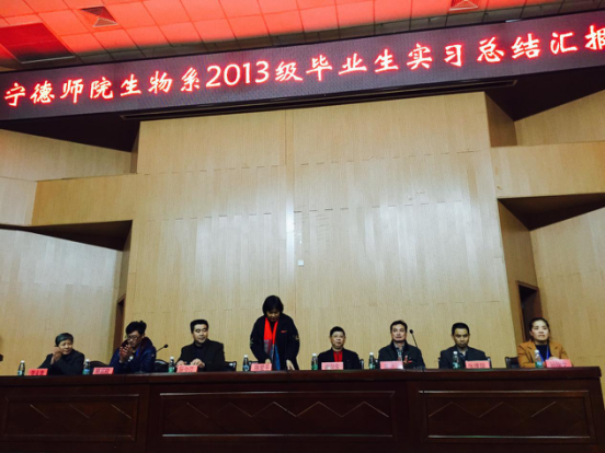 2016年12月29日下午,生物系在图书馆报告厅召开了2013级毕业生实习总结汇报会,出席会议的有谢向东副校长、教务处处长陈济川,阮少江副主任,张维瑞主任,宁德十中张永青副校长,南阳食品有限公司副总林邦辉,人力资源部经理孙锦文,以及生物系全体师生。会议由陈爱平书记主持。