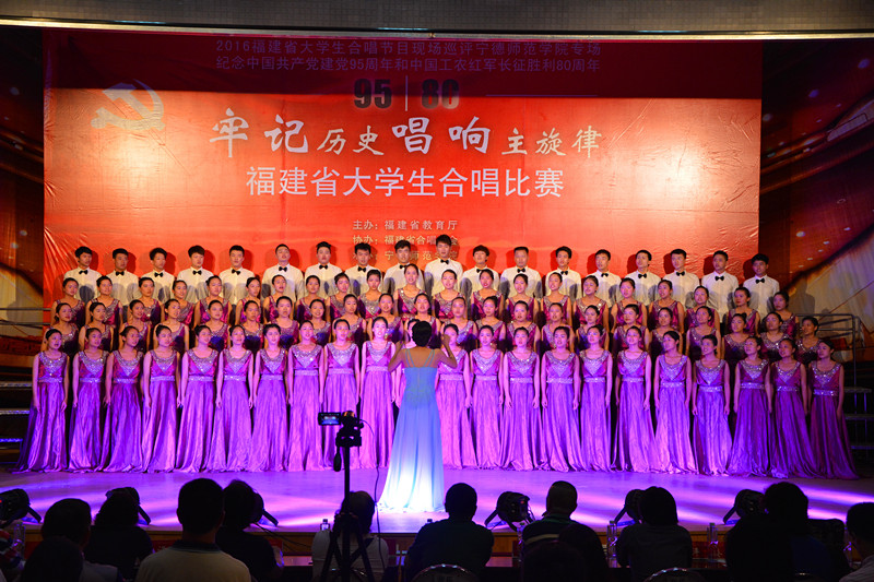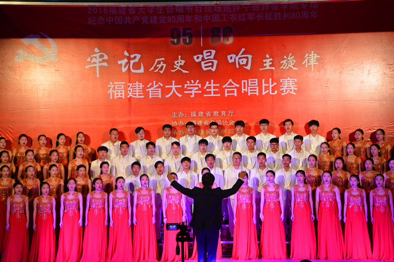 “美丽的草原我的家,风吹草原遍地花……”、“山水是那样迷人,天地是那样宽广,那里是东方一颗璀璨的明珠,是华夏一座艺术的殿堂……”由教育系80余名同学带来的经典曲目《美丽的草原我的家》、《去一个美丽的地方》以悠扬的旋律、婉转优美的清唱,一开场就赢得现场观众的掌声。“旗正飘飘,马正萧萧,枪在肩刀在腰……好男儿报国在今朝。”经典红色歌曲《旗正飘飘》在艺术系同学的专业演唱下,通过男女混声应和的形式,声音慷概激昂,节奏铿锵有力,将“国破家亡,祸在眉睫”的悲愤情绪以及人民要求抗战的炽烈深沉的爱国激情表现的淋漓尽致,具有很强的号召性,获得了现场评委老师的认可。