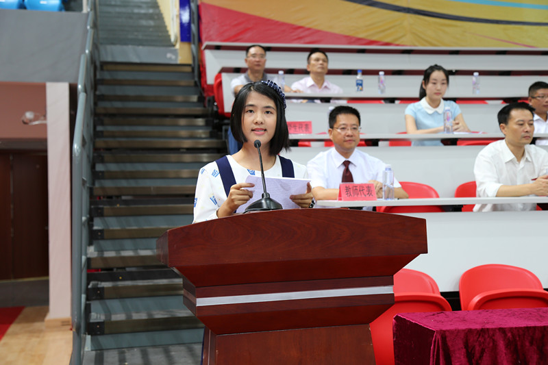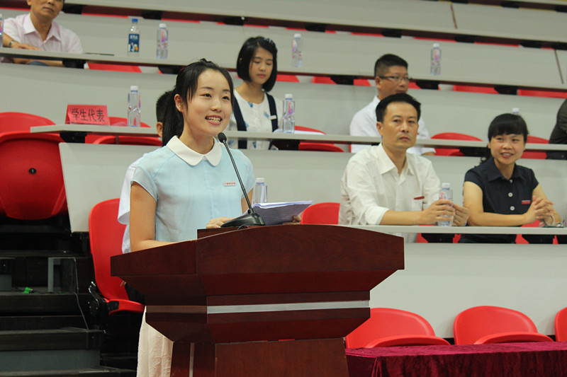 老生代表2013级学前教育专业余蓉蓉同学与全体新生分享了大学的学习和生活经验。新生代表2015级英语教育专业周晨琳同学谈了自己的入学感受,并代表全体新生表态发言。