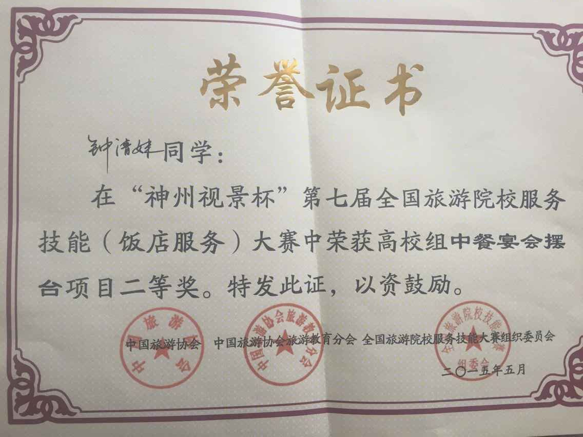 2015年5月5日至8日,由中国旅游协会主办,郑州旅游职业学院承办的“神州视景杯”第七届全国旅游院校服务技能(饭店服务)大赛在河南省郑州市举行。作为全国旅游院校的最高水平赛事,本届大赛吸引了全国30多个省234所高校近千名选手参加。