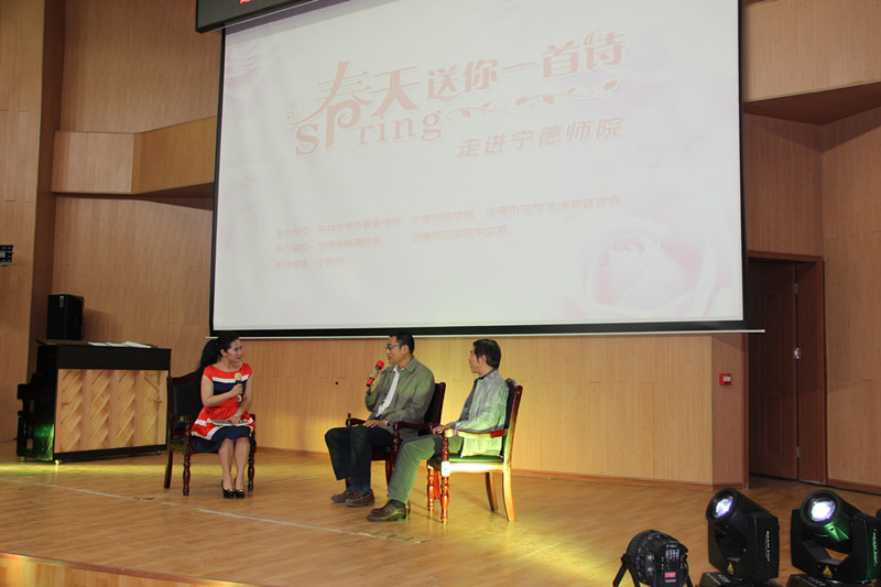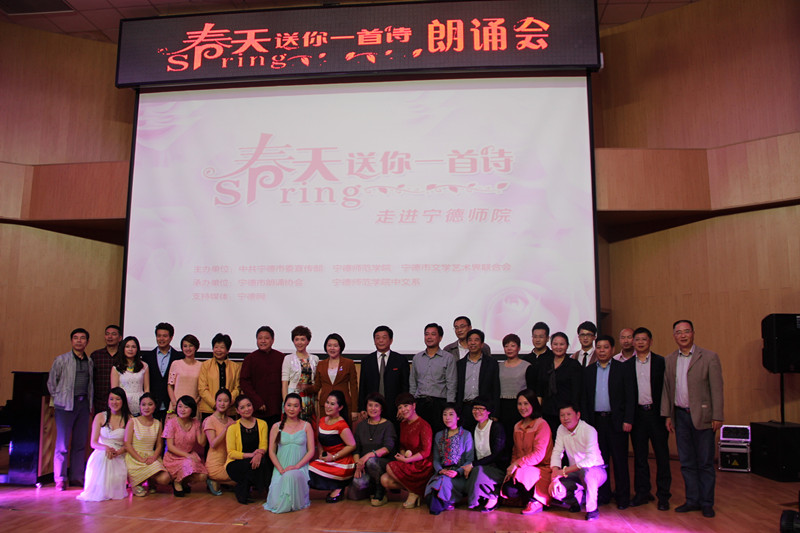 4月22日晚,由中共宁德市委宣传部、宁德师范学院、宁德市文学艺术界联合会主办,宁德市朗诵协会、宁德师范学院中文系承办的“春天送你一首诗”大型诗歌朗诵会在我校东侨校区举行。市委常委、宣传部部长、市文联主席徐姗娜、市政府副市长周秋琦、市政协副主席黄家盛、我校林跃鑫校长、谢向东副校长等领导和闽东诗人们亲临朗诵会现场。参加朗诵会的还有市委宣传部、市文联等部门领导、我校宣传部、中文系等单位领导、文艺爱好者和师生共计500多人。徐姗娜部长和谢向东副校长分别在朗诵会上致辞。