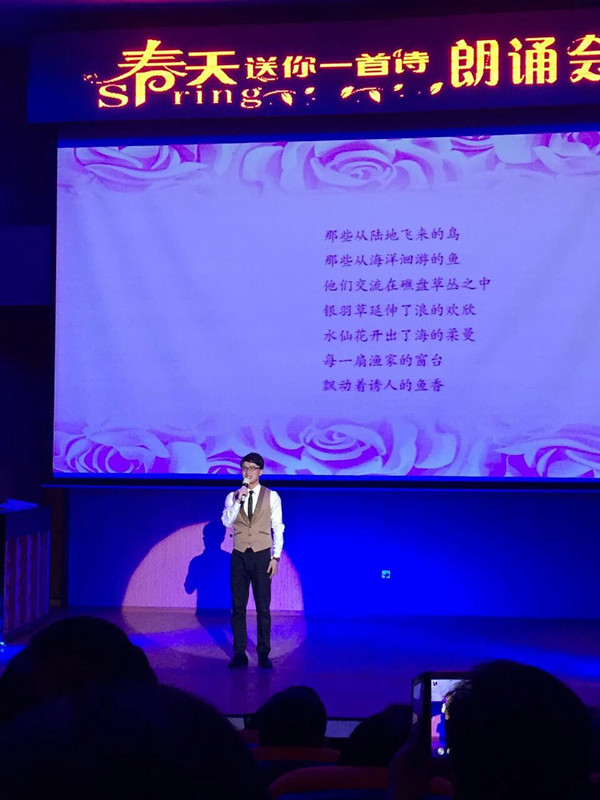 朗诵会在林跃鑫校长创作并激情朗诵的诗歌作品《岁月的河》中缓缓拉开序幕,接着,众多活跃在闽东广播、朗诵领域的能手登台朗诵“闽东诗群”丰富多彩的诗歌,其中还穿插现场采访闽东诗人、诗人与学生互动交流等环节。所朗诵的诗歌包括《那只鸟》、《光阴谣》、《春雨》、《春天的西洋岛》等14首原创诗歌,这些诗歌因其独特的自然环境和人文景观描绘,表现出鲜明的地域性和个性化身份特征,展现了闽东深厚的文化底蕴,描绘了一幅诗意闽东的美好画卷,具有很强的感染力,再通过悠扬的钢琴、小提琴、口琴伴奏和每位朗诵者声情并茂的精彩诵读,犹如春潮般地涌入在场所有师生的心田,并荡起阵阵涟漪。师生们陶醉其中,真切感受到诗歌的美好、生活的美好和未来的美好。