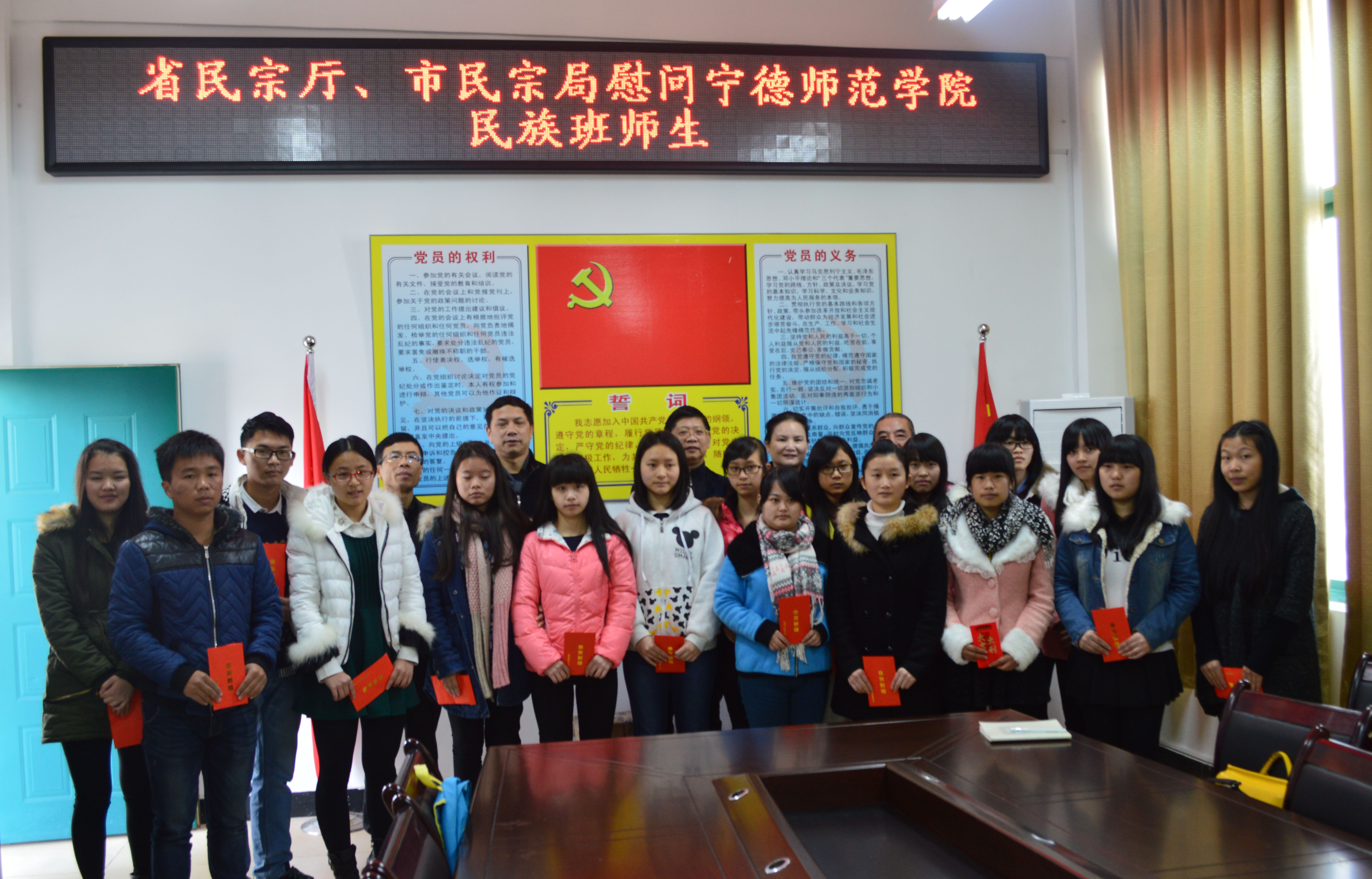 1月16日上午,宁德市民宗局副调研员韦希、社会事业科科长詹林主一行代表省市民宗部门莅临我校,到中文系走访慰问我校民族班师生代表。副校长谢向东、中文系主任伊漪、系党总支书记李颖伦陪同参加。