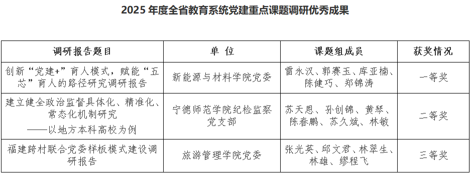 近日,中共福建省委教育工委公布了2025年度全省教育系统党建重点课题调研优秀成果名单,我校获得一等奖1项、二等奖1项、三等奖1项。