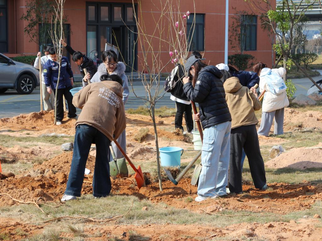上午9时许,植树活动正式启动。大家分工协作、配合有序,挥锹铲土、扶苗填坑、提水浇灌,每一道工序都认真细致、一丝不苟。现场气氛热烈,劳动热情高涨,充分展现了宁师师生积极向上、团结协作的精神风貌。经过近一小时的辛勤劳作,百余株新栽的玉兰树苗在校园安家落户,昂首挺立,在春风中焕发出勃勃生机。