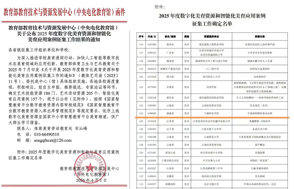 近日,教育部教育技术与资源发展中心(中央电化教育馆)正式印发通知,公布了2025年度数字化美育资源和智能化美育应用案例征集评审结果。我校教育学院蔡波尔老师申报的数字化美育资源《中国画构图的基本法则(共8节课)》成功入选艺术技能资源,将上线国家中小学智慧教育平台美育频道,面向全国广大师生开放共享、学习借鉴。