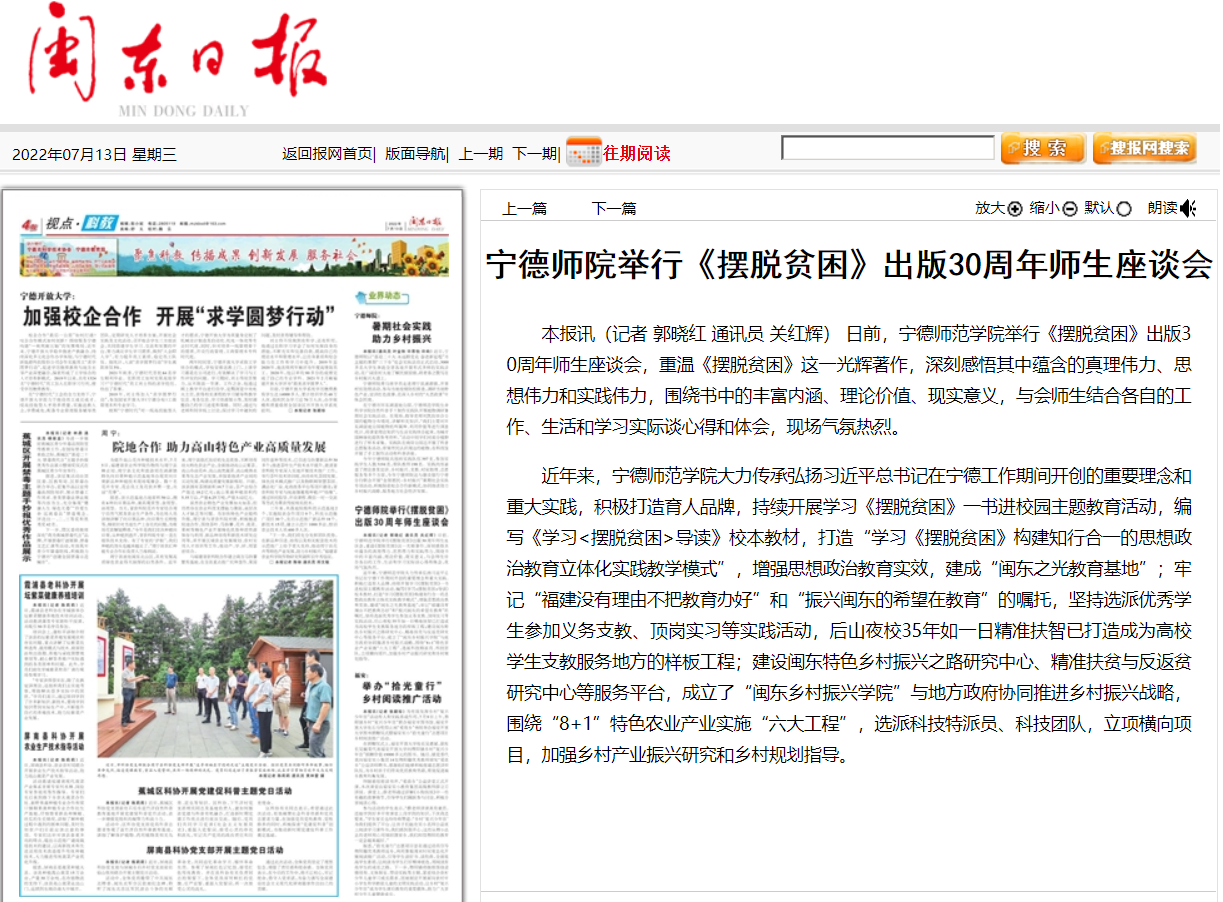 【闽东日报】宁德师院举行《摆脱贫困》出版30周年师生座谈会
