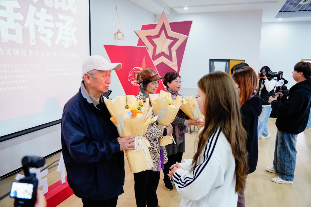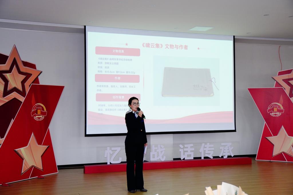 活动现场,黄烽将军后代黄安翼、毛莹以家人视角回溯家族记忆,从军装口袋里的“胜利糖”到深夜家书的煤油灯影,用鲜活细节勾勒出英雄铁骨柔情又肩扛家国的立体形象,质朴深情的讲述令在场师生数次动容;闽东畲族博物馆、闽东革命纪念馆工作人员则聚焦闽东独立师战旗、《啸云集》诗稿等抗战文物,以专业解读还原文物背后的战斗场景与信仰力量,让静态物证成为激活历史记忆的“精神密码”,不少师生热泪盈眶。学生代表苏婧雯讲述黄家祥烈士从“读书救国”少年到秘密战线战士的成长轨迹,谢美娜朗诵诗歌《不朽》致敬先烈,青春之声与历史回响交织,红色基因在代际讲述中愈发清晰可触。
