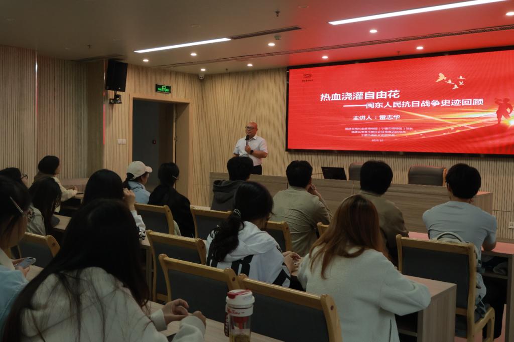 福建省闽东畲族博物馆(宁德市博物馆)馆长雷志华带领师生参观“闽东人民抗日战争史迹”专题展览并进行现场讲解。雷志华通过丰富的历史照片、文献资料和战斗序列图,以闽东子弟兵为骨干的新四军第三支队第六团的抗日战斗历程,通过时间脉络生动讲解了闽东儿女在中国人民抗日战争中所作出的突出贡献及英雄事迹。他还以“热血浇灌自由花——闽东人民抗日战争史迹回顾”为题,围绕“日侵闽东,历史罪证”“八闽之东,抗日救亡”“社会各界,爱国抗日”等三个部分作专题报告。运用详实史料和图片讲述闽东军民团结御侮的英勇壮举,回顾闽东社会各界众志成城、共赴国难的感人历史,激励青年学生们要铭记历史、珍爱和平,讲好闽东故事,担当时代使命。学生代表庄严现场朗诵陈毅元帅诗句《梅岭三章》,表达了革命先烈坚定不移的理想信念和视死如归的英雄气概,将活动气氛推向高潮。