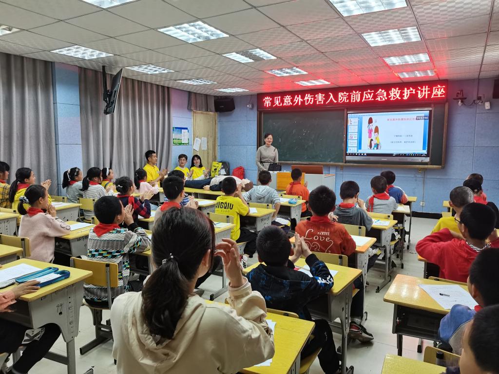 入户调研完成后,项目组赶赴路下乡中心小学为60多位高年级学生和部分教师开展应急救护讲座和急救技能实践训练。在讲座现场,项目负责人孙雪春副主任医师给该校师生分享“常见意外伤害的应急救护”理论知识与操作技能要领,特别强调“黄金急救4分钟”对于抢救“心脏骤停”患者的重要性,详细介绍从发现病人、评估现场是否安全、判断病人意识、快速判断病人呼吸、高声呼救、胸外按压、人工呼吸、电除颤心肺复苏流程,并演示了“救命神器”--AED机的使用。同时对气管异物、毒蛇咬伤、意外创伤、中暑等救护一一介绍,还着重介绍了小学校园最容易发生的创伤意外的现场救护,并通过互动、现场演示等方法加深师生们理解和学习的热情。讲座结束后,项目组成员还为该校师生们进行急救技能操作现场体验指导,手把手传教心肺复苏、气管异物急救、止血、包扎等技能。该校师生们学习的热情很高,积极参与演练和操作,初步了解掌握了心肺复苏等相关知识和急救技能。