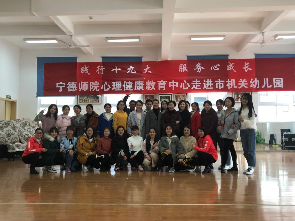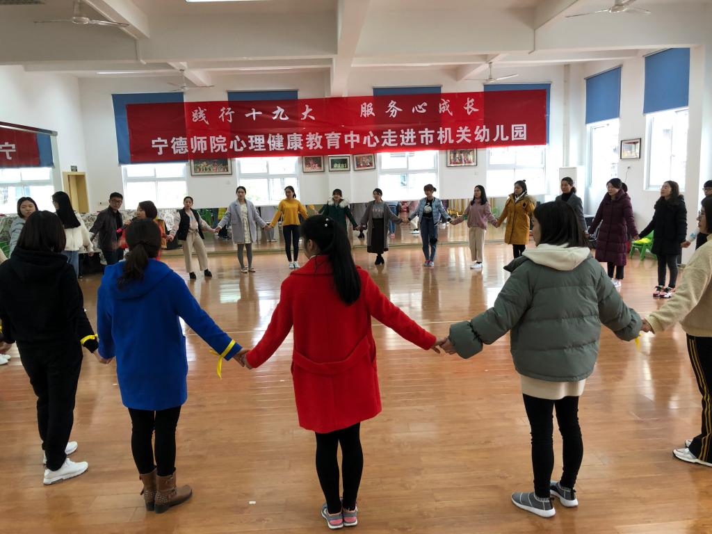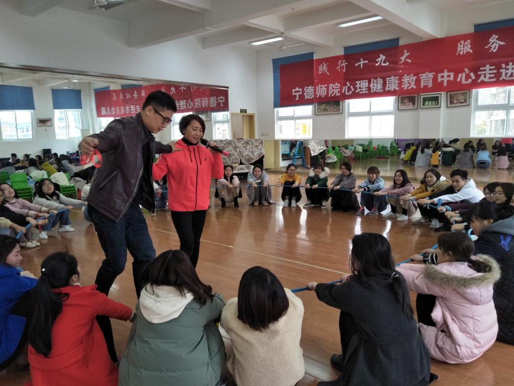 3月24日上午,由校学生工作部(处)主办、校心理健康教育中心承办的“践行十九大,服务心成长”心理健康服务社会系列活动走进市机关幼儿园。我校心理健康教育中心国家二级心理咨询师林新霞、欧嘉烟受邀前往宁德市机关幼儿园为该园的领导和老师们组织了一场别开生面的团体心理素质拓展活动。本次活动主题为“释放压力 感悟幸福”,来自市机关幼儿园的30多位幼儿教师参与本次拓展。