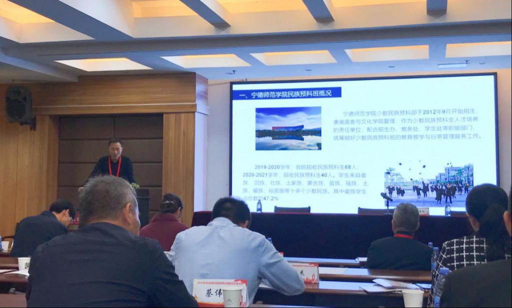 兰秀珍主持座谈交流会。会上,各高校院代表介绍了各校预科班的办学成果经验做法存在的问题。赵峰介绍了宁德师范学院预科班近年来在传承少数民族文化、促进民族团结进步教育方面取得的成果。