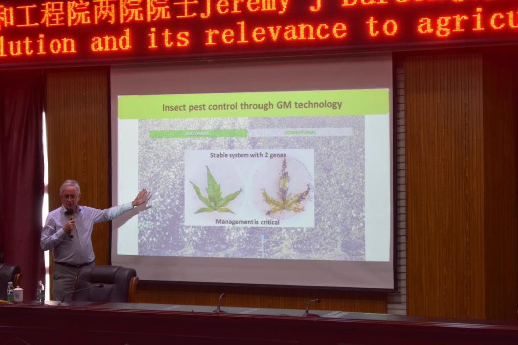 Jeremy J Burdon教授及詹家绥教授在行政楼三楼报告厅为广大师生分别做了题为“Host-pathogen coevolution and its relevance to agriculture”“Enhanced the sustainability of potato late blight management through intra-host diversity”的学术讲座。前者就宿主-病原体共同进化过程及其与农业、自然资源管理的相关性进行阐述,揭示了控制农业疾病的若干种方式。后者在报告中详细描述了寄主多样性对马铃薯晚疫病的影响。两位教授均基于大量研究背景为我校师生开展了一场兼具科普性和指导性的学术讲座。同时Burdon教授对我校学生的专业学术热情表示肯定。