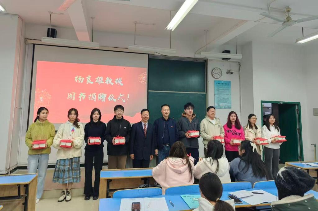 杨良雄校友深耕英语教学一线数十载,作为宁德市首位英语类省级优秀青年教师,他曾荣膺全国五一劳动奖章、福建省杰出人民教师等多项荣誉,教育实践与学术研究成果在省内外外语教育领域颇具影响力。本次捐赠的图书《教我所爱 爱我所教——中学英语教育教学探索》《基础外语教育落实学科育人的路径研究》均由其个人撰写,凝结其多年教学经验与学术积淀,兼具实用性与指导性。