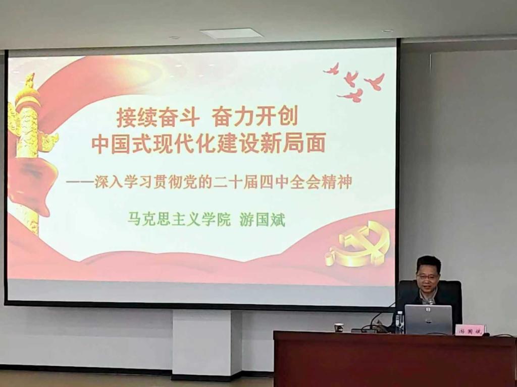 游国斌教授围绕党的二十届四中全会的重大意义、“十五五”时期在基本实现社会主义现代化进程中的重要地位等五个方面,全面阐释了全会精神的核心要义。报告既有高屋建瓴的政治站位,又有贴合宁德实践的深度解读,为学院师生精准把握、深入贯彻全会精神明确了实践路径、指明了前进方向。