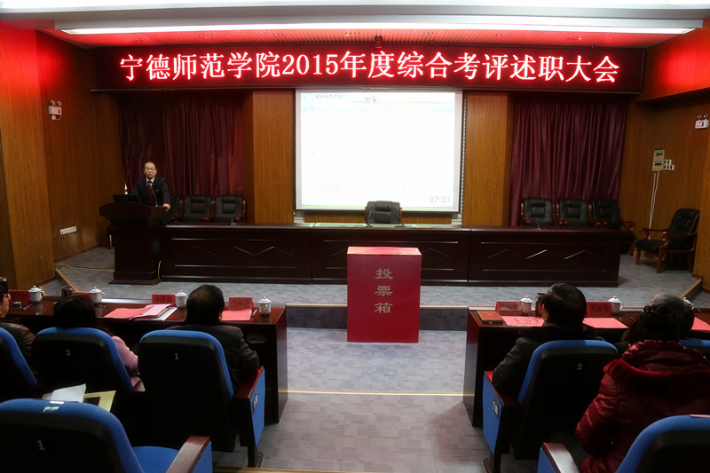 2016年1月24日,宁德师范学院2015年度绩效综合考评述职评议会在东侨校区办公楼三楼报告厅召开,会议由校党委副书记徐晓丹主持,全体校领导及各系、各部门主要负责人参加了本次会议。