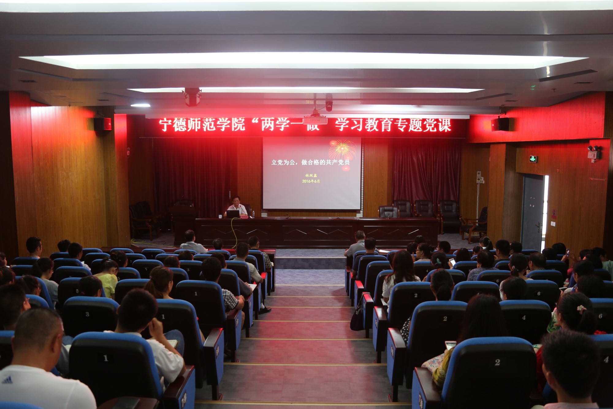 7月5日下午,原校长林跃鑫教授以“立党为公,做合格的共产党员”为题,在东侨校区行政楼三层报告厅为机关总支、外语系、生物系100多名党员作“两学一做”学习教育专题党课。