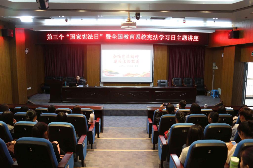 2016年12月6日下午,我校经济管理系法学教授吴家林老师为全校师生做题为“弘扬宪法精神 建设法治校园”的讲座,全校300余名师生参加。讲座从国家宪法日的提出、设立国家宪法日的重要意义、几个典型的直接涉及宪法的案件和弘扬宪法精神,建设法治校园四个方面来讲。通过古今中外的对比和典型案例的解读,寓教于乐,让同学们更生动形象地学习宪法。讲座现场 吴家林教授做题为“弘扬宪法精神 建设法治校园”的讲座