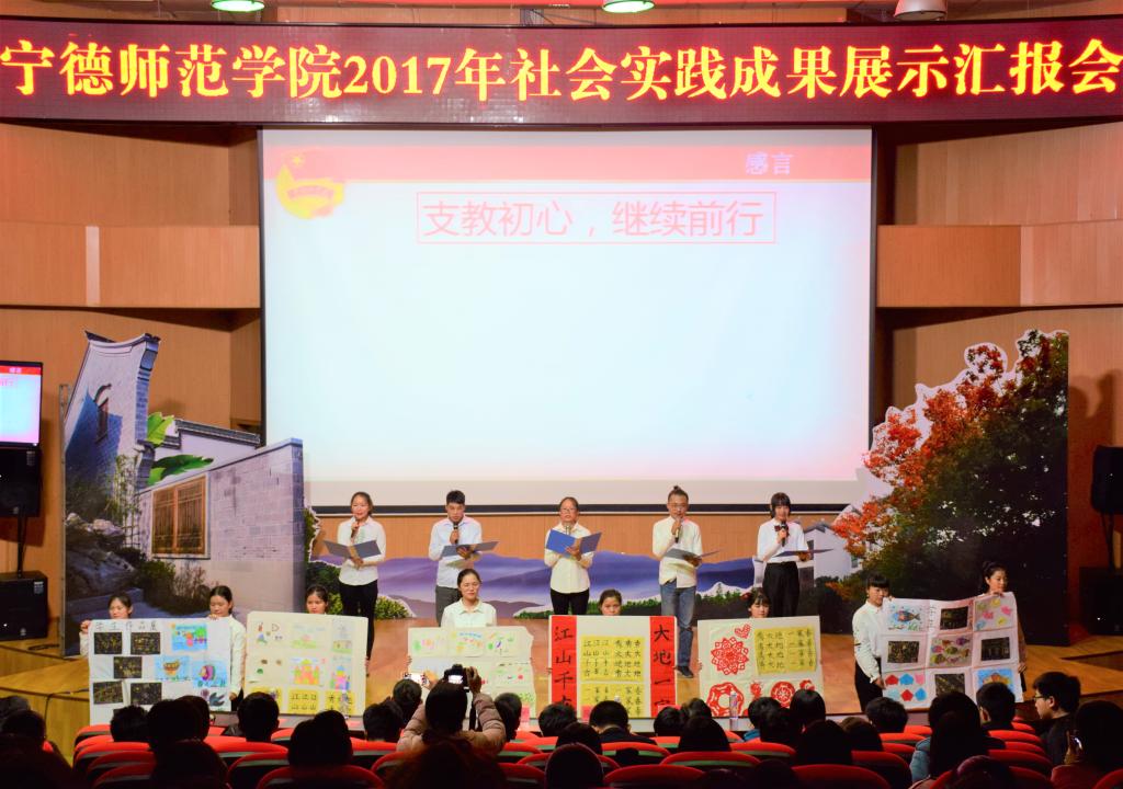 12月5日晚,我校2017年社会实践成果展示汇报会在学校图书馆报告厅举行。党委委员、副校长颜桂炀出席会议,校社会实践工作领导小组成员、各二级学院团委书记及相关社会实践指导教师等460多人一同参加了汇报会。汇报会以“学做结合,青春扶贫”为主题,分为“我心向党”、“青春扶贫”、“不忘初心‘小陶子’”、“志愿服务‘关爱行’”四个篇章,共18支团队参与了汇报。 汇报会上,各个团队采用PPT、情景剧、朗诵等丰富...