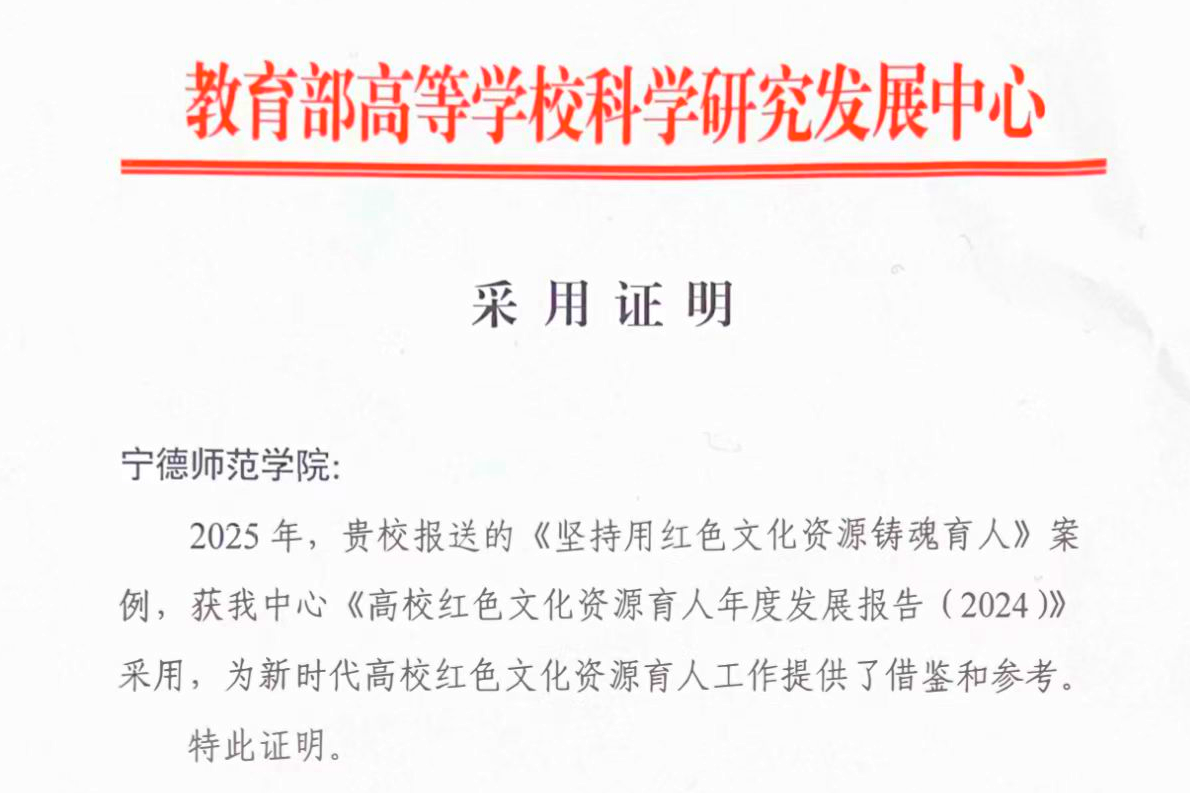 近日,我校报送的《坚持用红色文化资源铸魂育人》案例,被教育部高等学校科学研究发展中心《高校红色文化资源育人年度发展报告(2024)》采用,该案例为新时代高校红色文化育人工作提供了宝贵借鉴和重要参考。多年来,宁德师范学院深入学习贯彻习近平总书记关于弘扬红色文化、传承红色基因的重要论述,持续推动红色文化资源铸魂育人,在红色文化资源融入思政课教学、校园文化建设、社会实践活动等方面取得了诸多成效,形成了一...