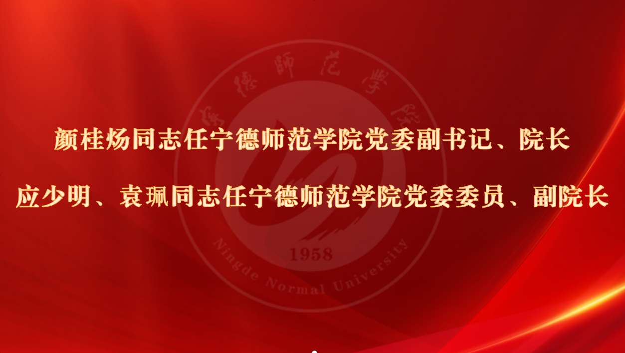 日前,经中共福建省委研究决定,颜桂炀同志任中共宁德师范学院委员会副书记、宁德师范学院院长;应少明、袁珮同志任中共宁德师范学院委员会委员、宁德师范学院副院长