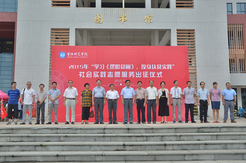 7月3日,我校2015年大学生“学习《摆脱贫困》,投身扶贫实践”主题社会实践志愿服务出征仪式在东侨校区图书馆前广场举行。