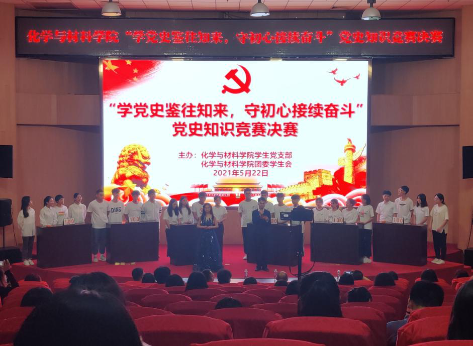 为迎接建党100周年,引导青年学子学党史、知党情、跟党走,广泛深入推进党史学习教育,进一步增强党史学习效果,5月22日晚,化学与材料学院学生党支部在图书馆报告厅举办“学党史鉴往知来,守初心持续奋斗”党史知识竞赛。学院党委和学生党支部负责人参加了活动。本次参赛的6支队伍是从笔试初赛中脱颖而出的。竞赛围绕百年风华、不忘初心、艰苦奋斗等主题,设置了 “必答题”、“抢答题”、“线索题”、“风险题”、“互动题”...
